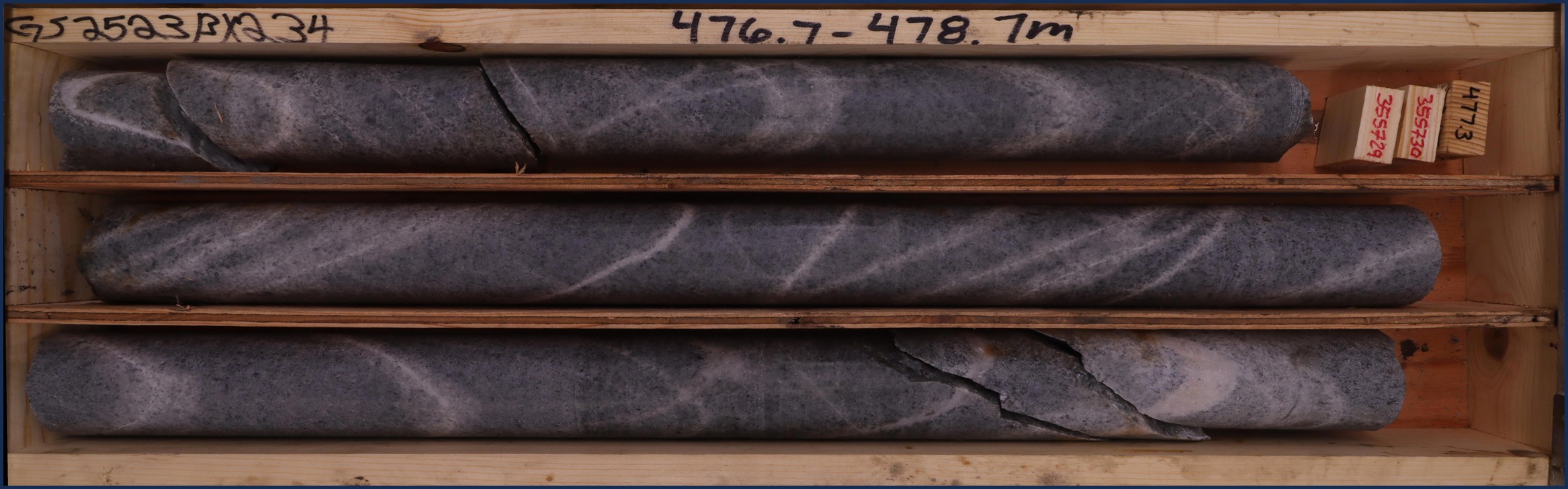 HQ Core is logged, photographed and cut in half using a diamond saw, and one-half placed in sealed bags for preparation and subsequent geochemical analysis by MSA Laboratories in Fairbanks, Alaska or ALS’s facilities in Vancouver and Thunder Bay. At MSALABS, the entire sample will be dried and crushed to 70% passing -2mm (CRU-CPA). A ~500g riffle split was analyzed for gold using CHRYSOS PhotonAssay™ (CPA-Au1). From this, 250g will be further riffle split from the original PhotonAssay™ sample, pulverized, and a 0.25g sub-sample analysed for multi-element geochemistry using MSA’s IMS230 package, which includes 4-acid digestion and ICP-MS finish. MSALABS operates under ISO/IEC 17025 and ISO 9001 certified quality systems.