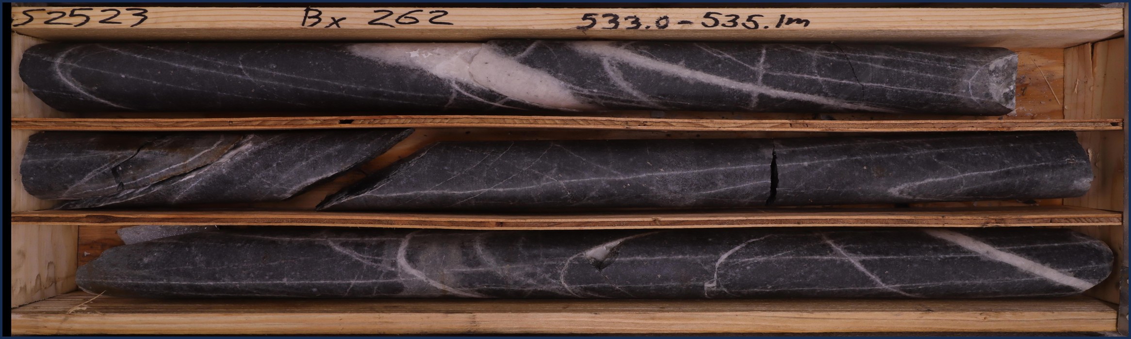 One of the southernmost holes drilled in the Dolphin Zone demonstrates the continuity and robust nature of the system, clearly indicating the potential to expand further and increase the overall grade at Golden Summit, and it remains open to the south and southwest. Furthermore, it is one of the broadest gold mineralized intervals within the intrusive seen to date. Of particular significance is the intercept of 1.24 g/t gold over 277.1 meters, which includes a higher-grade zone of 3.63 g/t Au over 45.4 meters, consisting of sheeted quartz veinlets and rare visible gold almost entirely within the intrusive.