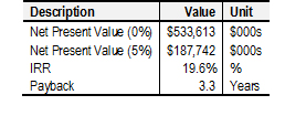 A post-tax NPV5% and IRR of $188 million and 19.6% respectively;
